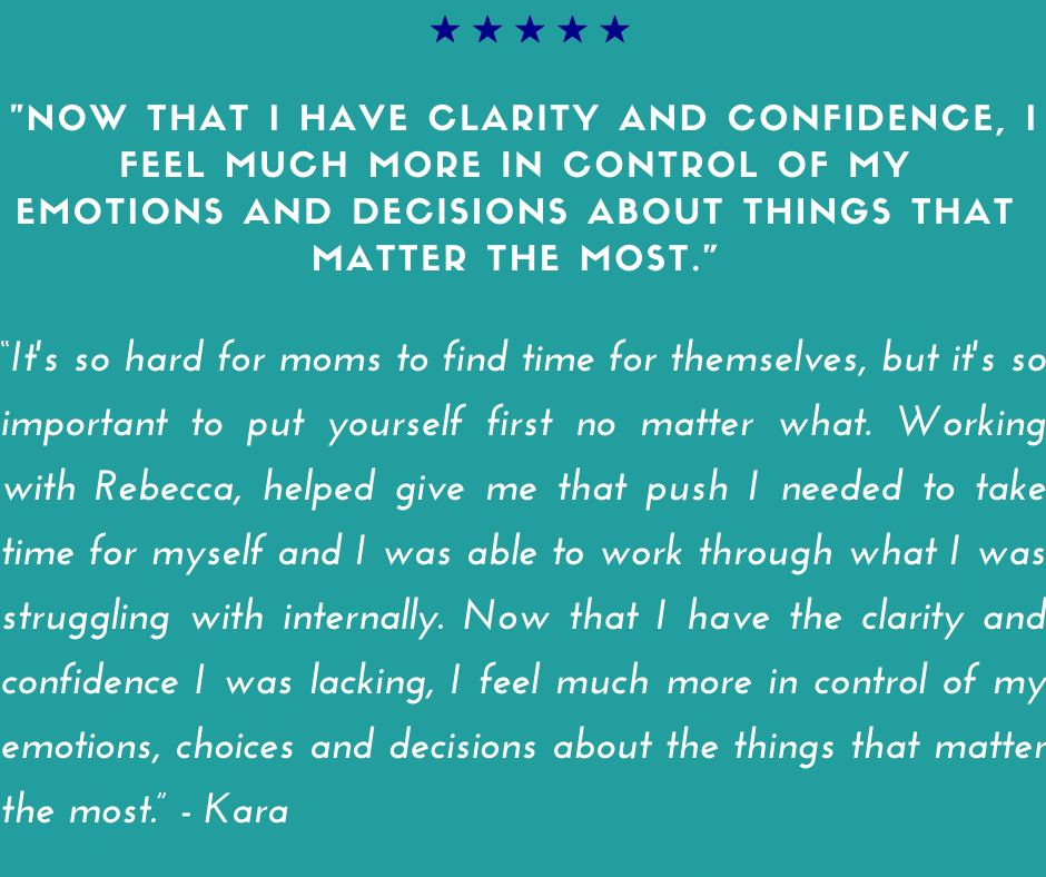 '“For over a decade, I’ve let work dominate my life to the point where it became my identity. Now with a baby, I had an identity crisis. I am now a mom, and simply am not able nor want work to have that type of dominant role in my life. Rebecca helped me step back and think about my self-concept and what I truly want. She helped me mentally shift my perspective, be comfortable saying no and have stricter boundaries between work and life. More importantly- she’s helped me shift my thinking to not feel guilty! Rebecca has been an amazing coach, and I will definitely call her again when I need to resume coaching help.” - Elaine